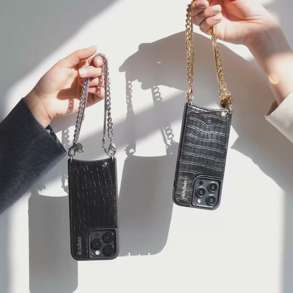 Protégez votre téléphone et complétez votre look avec un Dutchies. Fabriqué à la main en cuir véritable à 100 %, avec des finitions métalliques de qualité supérieure et deux anneaux pour attacher votre Cordon préféré. À l'arrière, vous trouverez un porte-cartes pratique avec une fermeture à bouton-pression sécurisée, gardant vos essentiels toujours à portée de main. L'étui dispose d'un bord surélevé en matériau TPU absorbant les chocs pour une protection supplémentaire. Grâce à son design ouvert, vous avez toujours un accès facile à votre téléphone. Élégant, pratique et totalement à la mode. ✨ Chaque étui est unique, avec des variations naturelles dans l'impression qui garantissent que deux étuis ne sont jamais exactement identiques, reflétant la nature sur mesure de la haute couture.